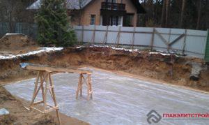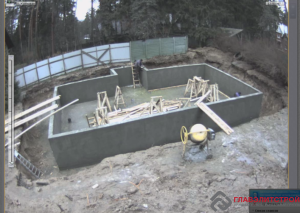 Установлена опалубка под плиту перекрытия и произведено армирование. Выполнена заливка бетона. Толщина плиты перекрытия цокольного этажа 200мм.