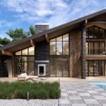 Усадьба Антуриум действительно являет собой современную версию скандинавского шале с обилием дерева и природного камня. Один из скатов пологой 2-скатной крыши очень длинный – он укрывает 4/5 дома и делает его визуально приземистым, словно вросшим в участок. Естественность строения усиливается натуральностью отделочных материалов и их природной палитрой – колонны крыши-навеса и дымоход камина облицованы антрацитовым «диким» камнем, лобовая доска карниза кровли – цвета махагон, а все каменные поверхности стен окрашены в оранжево-коричневый цвет, имитирующий деревянную фактуру, не говоря уже о балках, стропилах и других, по-настоящему деревянных, элементах. Большие площади остекления с трёх сторон дома делают особняк прозрачным снаружи и солнечным внутри. Одновременно дом выглядит и брутально-основательным, и лёгким, наполненным светом и уютом.