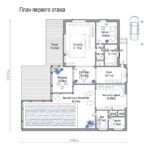 Первый этаж разделён на левую вспомогательную (меньшую) и правую основную по функционалу части. Слева – прихожая, гардероб, постирочная, два санузла и спальня. Праволе крыло (а это почти 2/3 площади этажа) занимают кухня – столовая и огромная гостиная с камином. Над гостиной отсутствует потолок, поэтому она в дневное время залита солнечным светом, проникающим и через панорамное остекление второго уровня. Их кухни, соединённой широким проёмом с гостиной, можно выйти на крытую террасу .