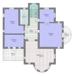 На 1 этаже – традиционные тамбур с гардеробом, холл, рабочий кабинет хозяина. Далее – гостиная и столовая. Их соединяет небольшой проём, а в каждом помещении как раз и есть эркер, эффектно увеличивающий пространство. Кухня отделена от столовой стенкой с дверью.