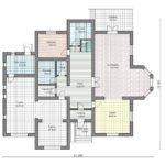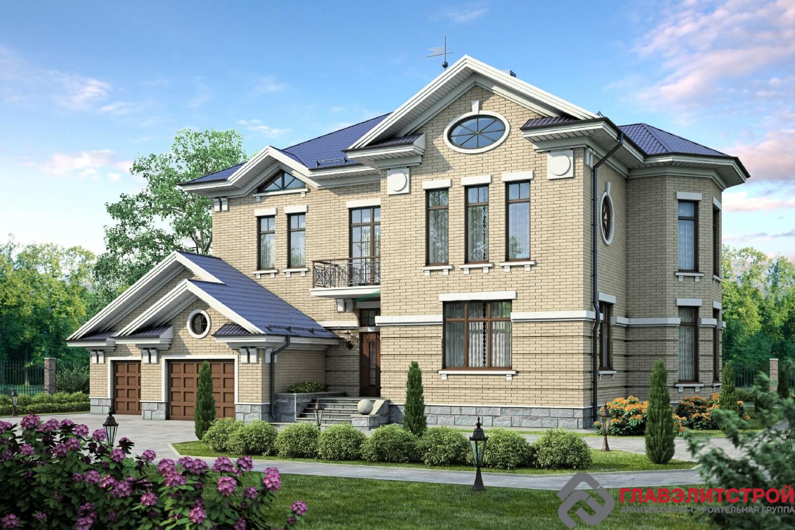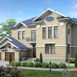 Перед крыльцом солидно обрамлённые ступеньки и небольшая цветочная клумба. Через тамбур попадаем в холл и начинаем путешествие по 1 этажу. Сразу справа – кухня, соединённая проёмом с большой (более 55 кв. м) гостиной с увеличивающим площадь эркером. Из гостиной есть выход на небольшую террасу. Слева от холла гардероб и ванная с санузлом. В дальнем конце холла – немного заглубленное хоз. помещение. Перед ним слева – вход в кабинет. Слева от крыльца – внушительный гараж на три автомобиля с двумя въездами. За крайним слева помещением гаража – котельная.