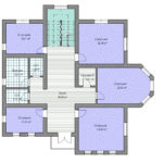 Второй этаж — спальный корпус. Четыре спальни расположены по углам, а пятая – между угловыми помещениями правого крыла. Именно она использует дополнительное пространство, созданное эркером. На этаже есть также общий гардероб, ванная и два санузла. Из холла можно выйти на маленький балкон над крыльцом.