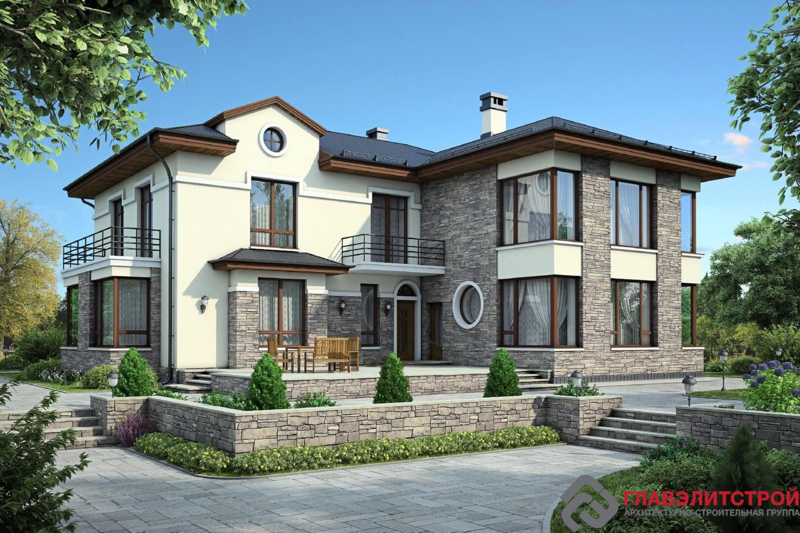 Усадьбу Гафт так и хочется назвать виллой – настолько органично она смотрелась бы на южно-французском Лазурном берегу или на побережье Коста-дель-Соль в Испании. Средиземноморский стиль – первое, что приходит на ум при взгляде на это изумительное сооружение. Во-первых, строго прямоугольная архитектура, во-вторых – обязательное наличие огромной террасы и балконов, на которых можно наслаждаться щедрым солнцем и загорать. В третьих – сливочный цвет штукатурки и обилие «дикого» камня в отделке, придающего рустикальный шарм. Ну, и крыша с очень пологими скатами, над гостиной едва ли не горизонтальная. Большие площади панорамного остекления делают усадьбу более современной, не смотря на то, что треугольник фронтона над спальней левого крыла настойчиво напоминает о неувядающей классике. Эркеры, фронтальный в рабочем кабинете и, особенно, застеклённый боковой в гостиной, удачно разнообразят плоскости стен.
