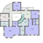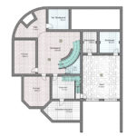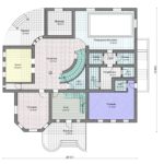 Внутреннее наполнение в полной мере соответствует званию дворца. Цокольный этаж многофункционален и до предела насыщен как полезными, так и развлекательными помещениями. В правой его части – гараж на два автомобиля, мастерская и котельная. Под центральным входом – две вместительные кладовые, одна из которых – холодная. А левая и центральная части отданы на откуп релаксу и развлечениям – кинозал, игровая комната и огромная бильярдная, совмещённая с полукруглым баром. В задней части цоколя – небольшое техническое помещение.