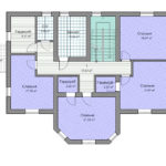 На 2 этаже – симметрично расположенные (относительно бокового эркера) 4 спальни и 2 гардероба для 2-х из них. Центральная спальня как раз и занимает этот самый эркер. Зато из левой спальни есть выход на балкон. Слева от лестницы, ведущей вниз, — ванная, санузел и ещё один, весьма вместительный, гардероб.