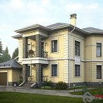 Усадьба Оскар – ещё один образец осовремененной классики. Главным элементом строения, буквально притягивающим взгляд с первых секунд, являются монументальные темно-серые колонны, поддерживающие балкон и фронтон над ним. Они словно пронизывают балкон и выглядят вынесенной наружу несущей конструкцией, придавая всему зданию мощь и основательность. Основной прямоугольник здания освежают массивный пятигранный эркер с правой стороны и пристроенный слева гараж с четырёхскатной крышей. Минимум декоративных деталей и спокойный цвет миндального масла, в который окрашена штукатурка, уравновешивают брутальность фасада и придают дому ощущение уверенности, умиротворения и надёжности.