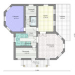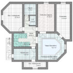 Эркерные пространства цоколя занимают бассейн и хозяйственное помещение. Один выход из помещения бассейна ведёт через холл в сауну, второй – в комнату отдыха. По соседству размещены также котельная, кладовая и хоз. помещение поменьше.