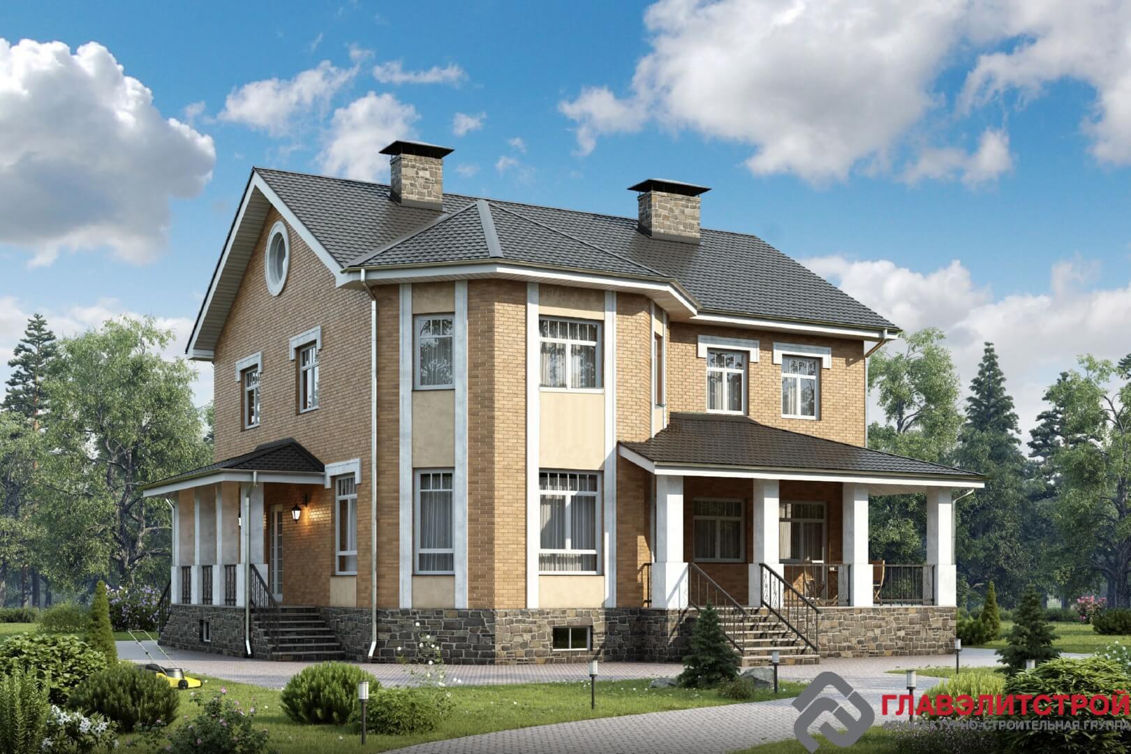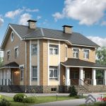 Поднявшись по ступенькам на крытое крыльцо с колоннадой, вы попадаете сначала в прихожую, проходите холл и — к вашим услугам гардероб. Слева от холла – два лестничных марша на цокольный этаж и спальня. Справа — вход в гостиную, которая далее, через дверь, соединяется с кухней.