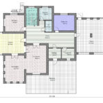 Набор помещений 1 этажа настолько же предсказуем, насколько и функционален: после тамбура и гардероба – холл, из которого двери ведут в рабочий кабинет, гостиную со столовой, кухню и спальню. Кроме того, холл соединён также с гаражом с двумя въездами, пристроенным к дому с правой стороны. Непременные раздельные ванная и санузел размещены как на первом, так и на втором этажах. Перед фасадом дома жильцов и гостей встречает большая открытая терраса.