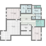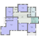 Поднявшись по лестнице на 2 этаж, вы очутитесь в империи Сна – целых 5 спальных комнат занимают почти весь периметр. В самой большой из них (55 кв. м) есть свой гардероб. Ещё одна гардеробная комната – в холле. Кроме того, в правом дальнем углу размещены ванная и два санузла.