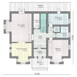 Холл 1 этажа разделяет тамбур и гардероб. Справа от входа – кабинет и ванная с раздельным санузлом. Слева – просторные кухня-столовая и гостиная, из которой можно выйти на открытую террасу. В заднем правом углу расположилась котельная.