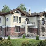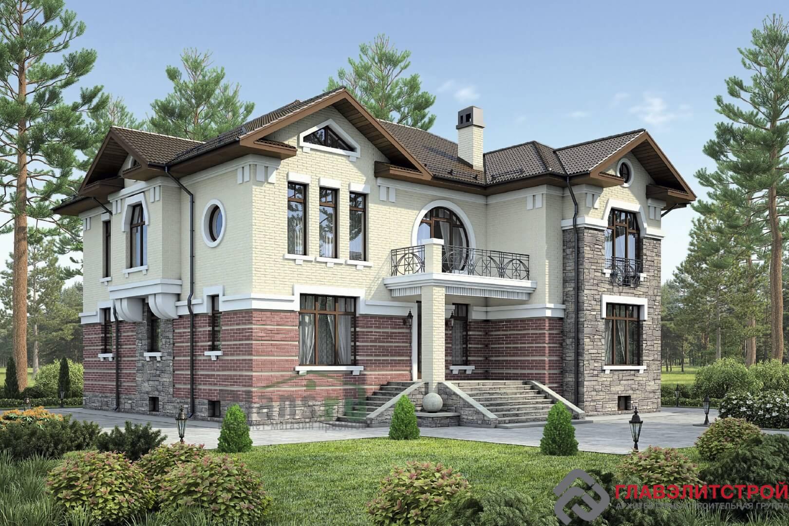 Усадьба Gloria – шикарный образец загородного дома для большой семьи, любящей детей. Это впечатляющий двухэтажный особняк в классическом стиле, с ненавязчивым, но очень уместным декором. Прямоугольные, квадратные, трапецеидальные и круглые окна, боковые эркеры, а также разноплановая фактура отделки разных участков стен делают усадьбу весьма привлекательной и не скучной внешне. А внутри предусмотрена едва ли не идеальная по функционалу планировка помещений.