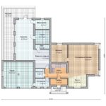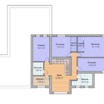 Центральную и переднюю часть 2 этажа занимает холл с прямоугольным эркером, а заднюю – спальный блок из 3 спальных комнат и 2-х гардеробов. По бокам от передней части холла – кабинет и ванная.