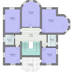 На втором этаже размещены сразу 5 спальных комнат, в которых благодаря обилию больших окон днём всегда царит солнечное настроение. Из двух угловых спален предусмотрены выходы на шикарный полукруглый балкон, украшающий фасад.