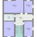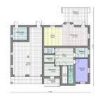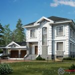 Не самый большой по площади двухэтажный дом обладает всем жизненно необходимым функционалом. Ярко выраженное ступенчатое крыльцо через прихожую и гардероб приглашает в небольшой холл, после которого следует привычная для 1 этажа гостиная, без перегородки граничащая с кухней. Из холла есть входы в спальню, ванную и санузел, а из гостиной можно попасть на такую же по площади террасу сзади дома. С левой стороны к дому пристроен большой гараж на 2 автомобиля и котельная. Солидная лестница ведёт на второй этаж к расположенным по углам четырём спальням разной площади, в которые можно попасть из центрального холла.