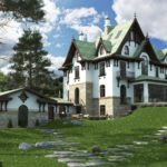 Если вы хотите пожить на Туманном Альбионе 19 века, не выезжая из России, то проект «Усадьба Гранде» — именно то, что вам нужно! Ассиметричная архитектура 3-этажного дома со сложной многогранной крышей, просторное крыльцо, характерная деревянная отделка и использование белого и бежевого цветов очень умело отсылают нас прямиком в викторианскую эпоху! При этом пристройка с бассейном к цокольному этажу, утопленная в зелёном рельефе участка, словно срисована с домика хоббитов из Шира в сказочном Средиземье. Не хватает только круглой двери и травы на крыше.