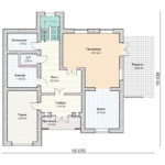 Первый этаж достаточно функционален – вместительный тамбур, по сути выполняющий роль прихожей, затем небольшой холл, из которого через распашные двери попадаем во внушительную Г-образную гостиную. Она, в свою очередь, соединена с кухней и имеет выход на уютную крытую террасу. В левом углу 1 этажа – гараж, ванная с санузлом и котельная.