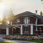 Усадьба Бордо – это современная смесь классики и Ренессанса. Дом выглядит очень красиво благодаря бордовой розе стен и контрастным белым вертикалям колонн и горизонталям парапетов. Многоскатная крыша, арка крыльца, обилие балконов и изящные колонны служат самодостаточными архитектурными украшениями для этого благородного особняка.