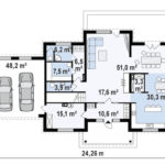 Торжественное крыльцо препровождает нас в большую гардеробную, ы левом углу которой вход в котельную. Прямо из гардероба мы попадаем в холл, совмещённый с гостиной общей площадью почти 70 кв. м. Здесь установлен камин. В правом крыле этажа – плавно перетекающие друг в друга кухня, малая и большая столовые. Здесь же компактная кладовка. Изо всех помещений, предназначенных для отдыха или приёма пищи есть выходы на открытую террасу, опоясывающую угол дома. В левом крыле, помимо упомянутой котельной, расположены ещё один гардероб, сауна, душевая и санузлы. С левой стороны к дому пристроен также гараж на 2 машины.