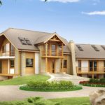 Проект Усадьба Монс можно рассматривать, скорее, как загородную резиденцию для приёмов с опцией мини-гостиницы, или вообще, как гостиницу. Этот проект рассчитан для строительства на разноуровневом участке, так как он идеально вписывается в подобный рельеф. Наличие рядом водоёма сделает этот особняк ещё более привлекательным. По архитектуре это скорее шале с элементами фахверка, так как отделка здания предполагает максимальное применение натуральных материалов – природного камня и дерева. Из дерева выполнены все колонны с подпорками, обрешётка фронтонов и ограждения террас и балконов. Грандиозные размеры усадьбы поражают воображение – площадь танцевального зала в цоколе гостиной превышает 100 кв. м, а террасы 1 этажа занимают в сумме почти 200 кв. м! Светлые оттенки коричневого цвета, преобладающие в оформлении экстерьера, создают вполне пасторальное настроение и подчёркивают единение с природой.
