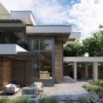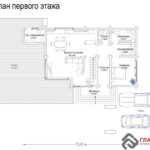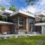 На 1 этаже предусмотрены небольшие прихожая, гардеробная, кладовая, санузел и тех. помещение. Справа от входа — спальная комната. Но основное место на этаже отведено лофту, состоящему из кухни, столовой и гостиной – практически квадратное помещение общей площадью почти 50 кв. м. Над гостиной нет потолка, а это значит, что весь солнечный свет, попадающий через два этажа панорамного остекления фасада, весь день хозяйничает в этой комнате. Справа от крыльца – навес для стоянки двух автомобилей, а слева угол здания обнимает огромное патио в 60 кв. м.
