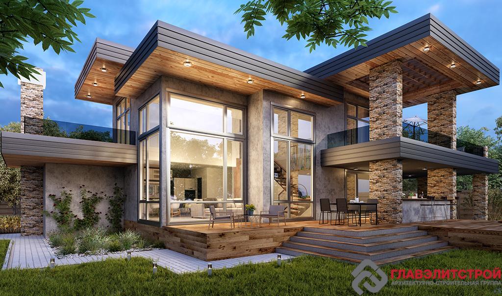 Усадьба «АГАТ» – уникальный для нашей коллекции представитель архитектуры хай-тек. Однако не в чистом виде – здесь присутствуют и минимализм, и даже элементы современного шале в виде брутальных каменных колонн и деревянной обшивки широких свесов и навесов. Зато налицо – строгость и лаконичность прямых линий, огромные остеклённые поверхности, принципиальный отказ от декора и обилие выступающих частей, в нашем случае – свесов и перекрытий. Символ хай-тека металл обозначен только в отделке периметра этих самых горизонтальных перекрытий. В плане здание само по себе совсем не большое, но благодаря своей приземистости и брутальности поддерживающих и несущих каменных колонн, а также широким свесам, выглядит надёжным хранителем вашего покоя. Одновременно с этим, оно почти прозрачно благодаря стеклянным стенам, и выглядит светло и воздушно.
