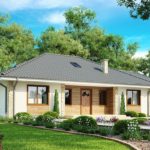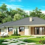Несмотря на скромные габариты, планировка дома вполне самодостаточна по функционалу. В боковой пристройке – гараж и хоз. помещение, в левой части дома просторная гостиная с камином и выходом на террасу и кухня-столовая. Сразу после входа в дом – гардероб и котельная справа. По центру и в углах правой части дома три спальные комнаты – взрослая и две детских, каждая со своим гардеробом. Между боковыми спальнями – ванная с душем и санузлом.
