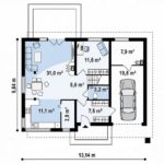 Прихожая, гардероб, санузел и холл привычно встречают нас после входа. Далее – рабочий кабинет с гардеробом. А слева от холла – гостиная с камином, объединённая со столовой и кухня. Она соединена со столовой широким технологическим проёмом и через дверь – с кладовой. С правой стороны здания последовательно пристроены помещения гаража (на одну машину) и котельной. Из гостиной есть выход на небольшую ступенчатую террасу.