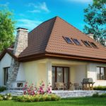 Проект Усадьбы Сокол тоже претендует на звание сказочного – небольшой домик с многоскатной коричневой вальмовой крышей и жёлто – белыми стенами словно сошёл со страниц сказок Шарля Перро про Кота в сапогах или Золушку. Аккуратный, с конусной серо-каменной трубой камина и такими же ступеньками крыльца и террасы, тёмно-коричневыми карнизом, дверными и оконными рамами, круглым окошком в гараже и мансардными окнами на крыше вызывает волшебные ассоциации и дышит уютом.