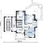 С входного крыльца мы попадаем в прихожую, слева от которой котельная, совмещённая с хоз.помещением, а справа холл, ведущий к остальным комнатам. В правом крыле – кухня-столовая и гостиная с камином и эркером, расширяющим пространство. Тут же – выход на открытую террасу позади дома. В центре этажа – санузел и лестница на 2 этаж, вдальней комнате – спальня с гардеробом. Слева от котельной ещё одна пристройка для одноместного гаража.