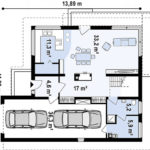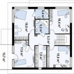 Планировка 1 этажа тоже сдержанна и функциональна. Прихожая отделяет вход от небольшого холла. Справа от него гардероб, слева большой каминный зал, объединяющий столовую и гостиную. Слева от столовой – кухня и кладовая. Из гостиной предусмотрен выход на небольшую крытую террасу. В дальнем правом углу здания, справа от лестницы, ведущей на 2 этаж – санузел и котельная. Справа от крыльца — въезд в пристроенный гараж на две машины, из которого также есть входы в котельную и прихожую.