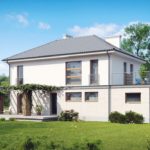 Усадьба Лунный свет является более интересной вариацией проекта Усадьба Луна, где за основу взят двухэтажный квадратный дом с белыми стенами.Правда, здесь минимализм больше уходит в сторону очень сдержанной советской послевоенной архитектуры с элементами конструктивизма. Основное строение сохранило строгие геометрические пропорции Луны, однако широкие горизонтальные окна уже чередуются с узкими вертикальными, как и раскладка в них. Главное же отличие – в геометрии 1 этажа. Во-первых, помещения кабинета и гаража выдвигают всю левую половину фасада вперёд, одновременно давая возможность уравновесить композицию перголой перед крыльцом. И ещё две аналогичные, но более масштабные, конструкции закрывают две другие террасы сбоку дома и на правом заднем углу, опоясывая его. И хотя горизонтальные оконца гаража и примыкающих к нему котельной и санузла делают эту пристройку похожей на блок-пост, декоративные никелированные решётки на некоторых окнах обоих этажей и такие же перила террасы-балкона придают усадьбе эффект современной технологичности. А вальмовая крыша, выкрашенная в редкий оттенок серого цвета «серо-синий крайола», вообще из области космостроения. Впрочем, окрашенные под дерево двери, колонны пергол-навесов и элементы стены 1 этажа тут же возвращают в лоно природной естественности.