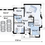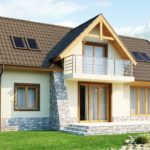 Планировка 1 этажа, как всегда, функциональна и практична – сначала гардероб и коридорного типа холл, кабинет и ванная с санузлом слева и котельная в задней части дома. Справа – лестница на 2 этаж и кладовка, вокруг которых размещены кухня, столовая с эркером и гостиная с камином. Из гостиной – обязательный выход на открытую террасу с никелированным ограждением. В левой пристройке находятся 2-местный гараж и хоз. помещение за ним.