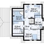 На 2 этаже – хозяйская спальня, две детских и гостевая. Гардеробы предусмотрены во всех комнатах, а ванная с санузлом – общая на этаж.