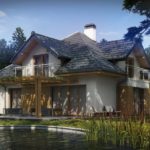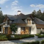 Если вы решите построить свою загородную резиденцию на лесистом участке, то лучшего проекта, чем Усадьба Куинджи вам не найти! Этот милый двухэтажный домик с многоскатной крышей викторианской эпохи легко представить стоящим на зелёной опушке в тени окружающих деревьев по соседству с речкой или прудом – совсем, как на лесных пейзажах «художника света» Архипа Куинджи или мастера «пейзажа настроения» Исаака Левитана. Серебристо-серая крыша укрывает от дождя белые стены, а обилие солнечного жёлто-коричневого дерева в отделке ещё больше роднит усадьбу с матушкой-природой. Деревом отделаны простенок слева от входа, центральная часть заднего фасада, эркер столовой и выступающие карнизы крыши. Природную идентичность усиливают деревянный навес террасы из бруса с такими же опорами и деревянные рамы всех проёмов дома. Разреженные балки навеса напоминают перголу и вполне могут быть использованы для создающих уют и тень вьющихся растений. Единственными элементами современности являются лишь застеклённые ограждения балконов и автоматические ворота гаража.