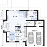 Двухместный гараж пристроен справа от входа и выдвинут несколько вперёд относительно фасада. С крыльца мы попадаем в тамбур с гардеробом. Холл как таковой отсутствует – после тамбура в путешествие по другим помещениям 1 этажа направляют два коридорчика, один из которых также обустроен гардеробом. В цент ре этажа маленькая кладовая и санузел. Если от тамбура свернуть налево, попадёте на кухню, а если пройдёте по центральному проходу прямо, очутитесь в гостиной с камином. Гостиная практически объединена со столовой и имеет выходы на заднюю террасу и в спальню. Помещение столовой существенно увеличивает прямоугольный эркер. За гаражом расположена котельная