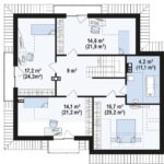 Второй этаж – царство сна. Здесь по периметру разместились четыре спальные комнаты с гардеробами. Три из них имеют выходы на прямоугольные балконы. В правой стороне этажа – ванная с санузлом. В центре небольшой холл.