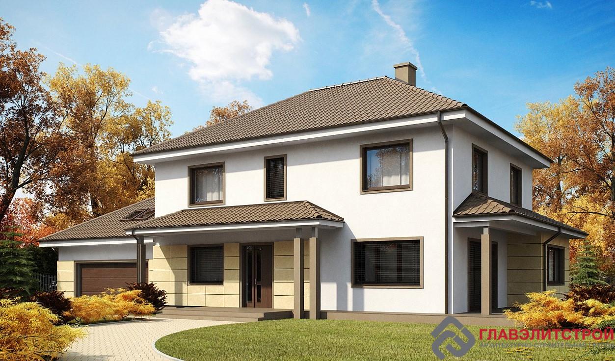 Усадьба Берёзовая аллея – для поклонников строгих линий и простой геометрии, скромность и практицизм предпочитающих внешнему блеску, вычурности и украшательству. Однако базовый прямоугольник дома смотрится совершенно не скучно благодаря внушительному угловому эркеру, в который поместилась целая столовая, и немного меньшей, чем ширина торца здания, ширине пристройки гаража. Колонны крыльца и террасы вроде претендуют на классику, но их несимметричность превращает их в обычных слуг функциональности. Довольно большой балкон очень современен решёткой никелированного ограждения, а прямоугольные и квадратные окна разнятся размерами и отношением к горизонту. А вот что всё-таки украшает усадьбу, так это очень умело подобранная палитра — к белизне стен аккуратно добавлены какао с молоком крыши и крем-брюле эркера и простенков 1 этажа. Такого же цвета рамы оконных проёмов удачно оттеняют тёмные глаза окон. Контрастным пятном выделяются только шоколадно-коричневые ворота гаража. Очевидно, что дом будет очень органично и уютно смотреться в окружении берёз, лип и клёнов.