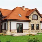 Усадьба Шафран – необычное сочетание благородной классики и милого сельского прованса. От первого стиля – торжественный портик с традиционным треугольным фронтоном и круглыми колоннами на входе, такие же колонны, поддерживающие балконы с торцов дома, карнизный фронтон на заднем фасаде и почти идеальная симметрия всего здания. Прованс наделили этот особняк яркой многощипцовой крышей с мансардными окошками и обилием натуральной отделки из природного камня – красивой мозаикой из бежево-коричневых камней цоколя, рустов с постаментами и центральных простенков переднего и заднего фасадов. Пасторальный дух усиливают деревянные балконы и цветовая палитра здания – шафрановая крыша, радостно контрастирующая с белыми стенами, и естественная окраска каменной отделки. А вот каштаново – коричневые колонны, двери и оконные рамы придают общему облику классическую строгость. Несколько необычно смотрятся усечённые цокольные пирамиды по углам дома, добавляя в имидж немного крепостной брутальности.