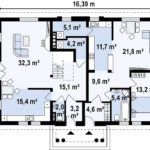 Планировка дома оригинальна тем, что рассчитана на проживание в доме двух семей, связанных родственными узами. Первый этаж разделён на две автономные половины со своим входом, каждая из которых имеет прихожую-гардероб, кухню, столовую – гостиную и санузел. Разница в том, что в правом крыле есть ещё спальня и ванная с санузлом, а гостиная левого крыла оборудована камином. При этом обе семьи имеют выходы из гостиных на свои мини-террасы.