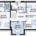 Второй этаж более демократичен – на нём есть общие холл и большая ванная с душем и санузлом. Примечательно, что слуховое окно ванной комнаты расположено как раз по центру фасадного фронтона. Для семьи, занимающей правую половину, на 2 этаже предусмотрены ещё три спальни с гардеробами, а для семьи левого крыла – одна спальня, рабочий кабинет и душевая с санузлом. Из спален обоих семей есть выходы на балконы.