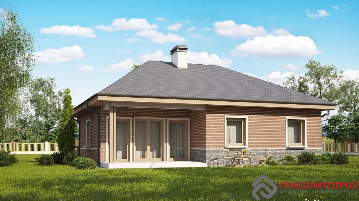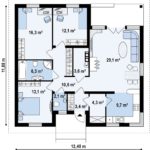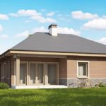 В центре жилища гардероб, санузел, маленький холл и котельная. В правой части дома – кухня, столовая и гостиная с камином, а также кладовая. Слева расположены три спальни с гардеробами (взрослая и две детских) и ванная с санузлом.