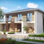 Несмотря на классическую 4-х скатную крышу, Усадьба Сигма – это минимализм и конструктивизм. Дом словно собран из прямоугольных геометрических фигур. И на лицевом, и на заднем фасадах выделяются полые бетонные параллелепипеды, выступающие вперёд, и как бы окаймляющие входную группу и террасы. Любопытна форма окон – если на лицевом фасаде все окна и двери представляют из себя узкие высокие прямоугольники, то сзади это уже полноценные большие световые проёмы. Объяснение очень простое – именно на дворовую часть дома выходят спальни и гостиные, которым нужно больше света. Нетривиальна и отделка дома – оба фасада облицованы красивым «диким» камнем, а торцы дома и ниши – гладкая белая штукатурка. Технологично и современно выглядит стеклянное ограждение балконов 2 этажа. А вот деревянные обрешётки из горизонтальных ламелей, спускающиеся со второго на первый этаж и напоминающие боковую стенку перголы, наоборот, добавляют ультрасовременному зданию толику натуральности и естественности. Эти декоративные решётки сбоку и сзади здания с успехом могут быть использованы, как опора для многолетних вьющихся растений – почему бы не украсить дом альпийским клематисом, луноцветом или девичьим виноградом? Особый шарм придаёт усадьбе и большая открытая терраса позади дома – шикарное место для летнего отдыха и загара.