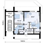Первый этаж дома начинается с прихожей, котельной (слева) и небольшой подсобки (справа). Далее миниатюрный холл с гардеробом, который разветвляется на самостоятельные помещения. Слева – вход в спальню, прямо – в гостиную. Та, в свою очередь, совмещена с кухней-столовой. Из гостиной можно выйти на красивую заднюю террасу, а из кухни – в кладовую. Слева к основному зданию пристроен гараж с выходом в техническое помещение.
